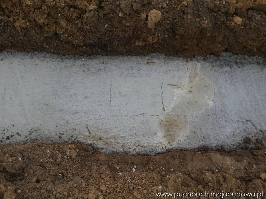 Tak wyglądała ława następnego dnia rano. podejrzenie, że zbrojenie zbyt płytko. Ale otulina jest ok. Bet. B25 W8, po prostu popękał odwzorowując zbrojenie. Poprężył się nieco. Zapaćkali mleczkiem cementowym żeby do zbrojenia woda nie dochodziła i już.